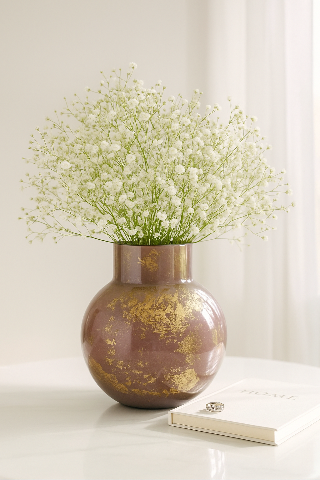 A beautifully crafted ceramic vase with an antique gold textured finish that adds depth and character to your décor. Its rounded silhouette and artisanal detailing make it a timeless accent, perfect for soft florals and elegant interior styling.